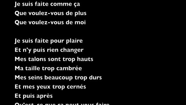 Poème de Jacques Prévert publié en 1946 dans le recueil "Paroles" Texte : Je suis comme je suis Je suis comme je suis Je suis faite comme ça Quand j'ai envie de rire Oui je ris aux éclats J'aime celui qui m'aime Est-ce ma faute à moi Si ce n'est pas le même Que j'aime chaque fois Je suis comme je suis Je suis faite comme ça Que voulez-vous de plus Que voulez-vous de moi Je suis faite pour plaire Et n'y puis rien changer Mes talons sont trop hauts Ma taille trop cambrée Mes seins beaucoup trop durs Et mes yeux trop cernés Et puis après Qu'est-ce que ça peut vous faire Je suis comme je suis Je plais à qui je plais Qu'est-ce que ça peut vous faire Ce qui m'est arrivé Oui j'ai aimé quelqu'un Oui quelqu'un m'a... Смотреть видео...