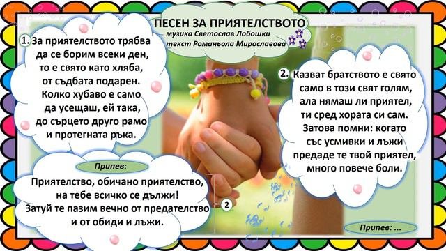 "Приятелството"-музика Светослав Лобошки; текст Романьола Мирославова; 5.клас, изд."Просвета"- Софи